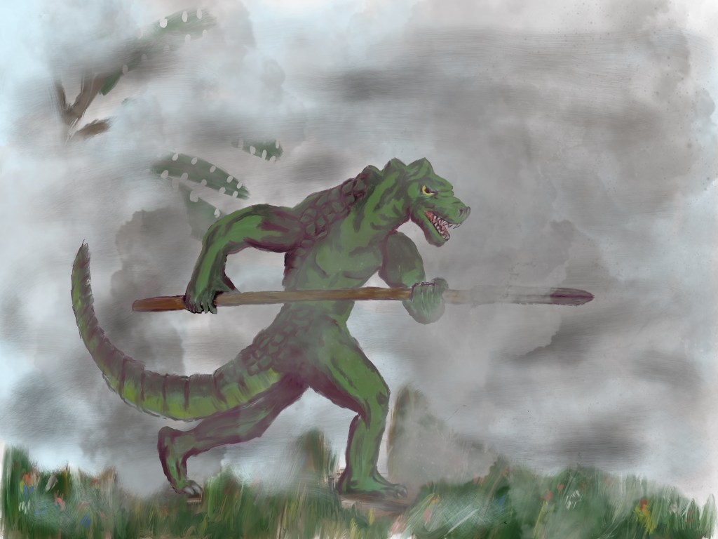 Ragnar could see a a tall shape in the mist, moving slowly toward him, he heard a sharp hiss then the splosh of feet as the shape advanced toward him. As it got closer he could see now coming out of the fog a humanoid shape, at least 6ft tall stooping fowards. A pair of yellow eyes blinked at him. Fear had rooted him to the spot as the creature came closer. A reptilian mouth opened and a long hiss came out. Sharp but irregular teeth lined the mouth. Strong muscular arms gripped a large crudely made spear with an iron tip, the spear pointed in his direction. Ragnar could see the large tail swishing behind the creature. It stopped and croaked some kind throaty noise. He ran. He fell. Ropes entangled him, more splashing and croaking noises.